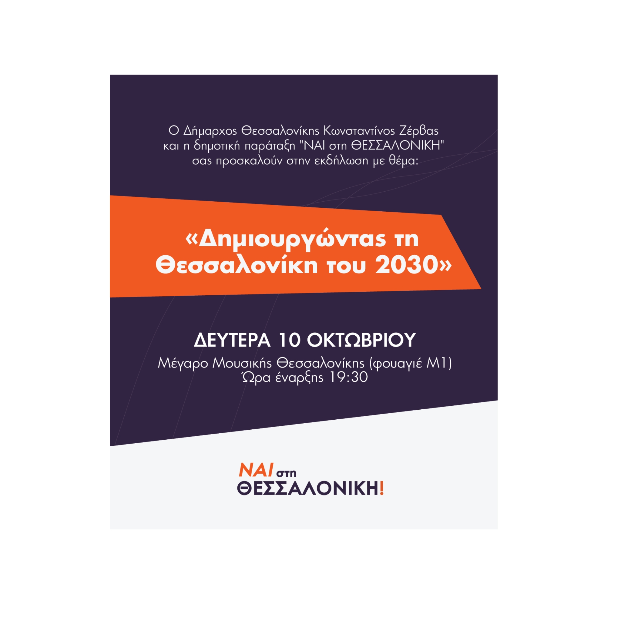 Σας προσκαλώ τη Δευτέρα 10 Οκτωβρίου στο Μέγαρο Μουσικής (Φουαγιέ Μ1) σε μια ανοιχτή εκδήλωση για το σήμερα, αλλά κυρίως για το αύριο της Θεσσαλονίκης. ΠΕΡΙΣΣΟΤΕΡΑ